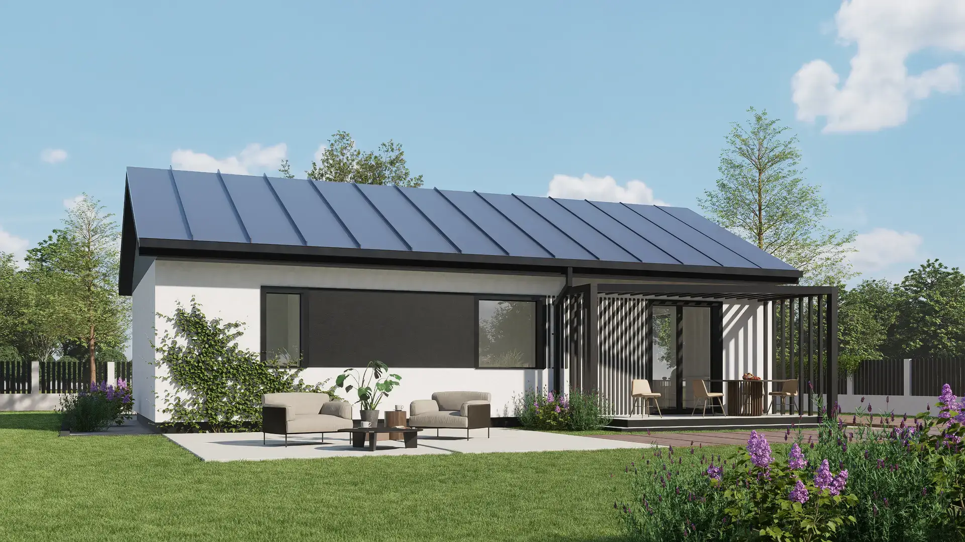 - Pokrycie dachu (blachodachówka) wraz z montażem. Rodzaj poszycia dachu do wyboru z naszego katalogu